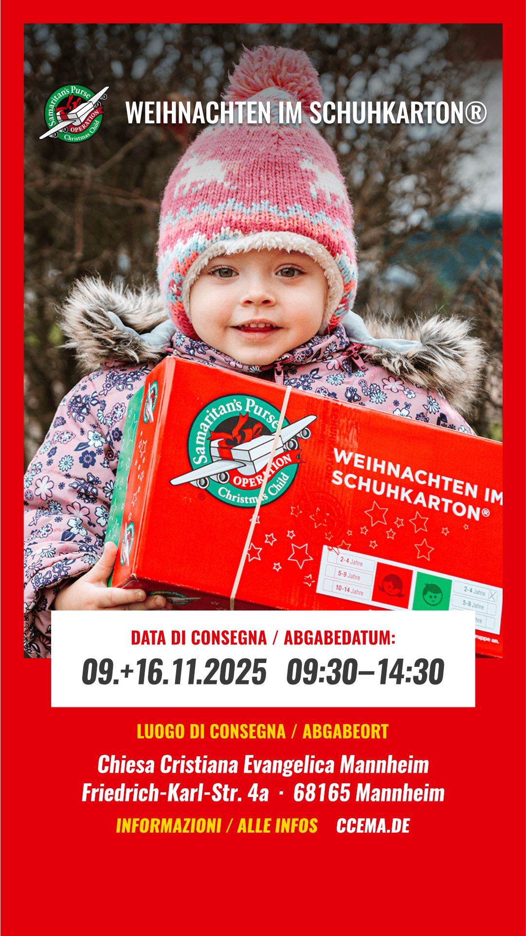 Wir freuen uns, dass wir auch 2025 als Chiesa Cristiana Evangelica Mannheim die Aktion “Weihnachten im Schuhkarton” von Samaritan’s Purse unterstützen zu können.